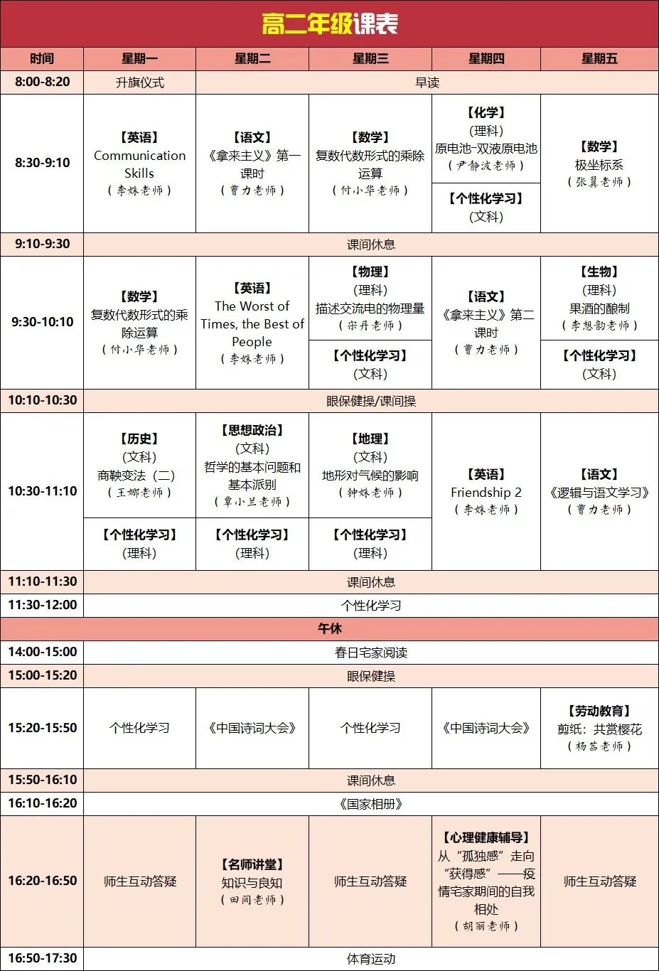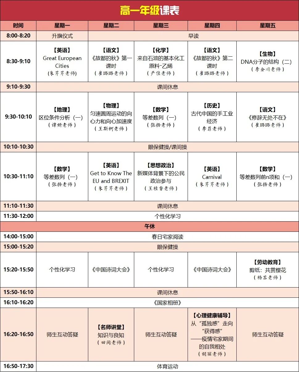 高中线上教学课表